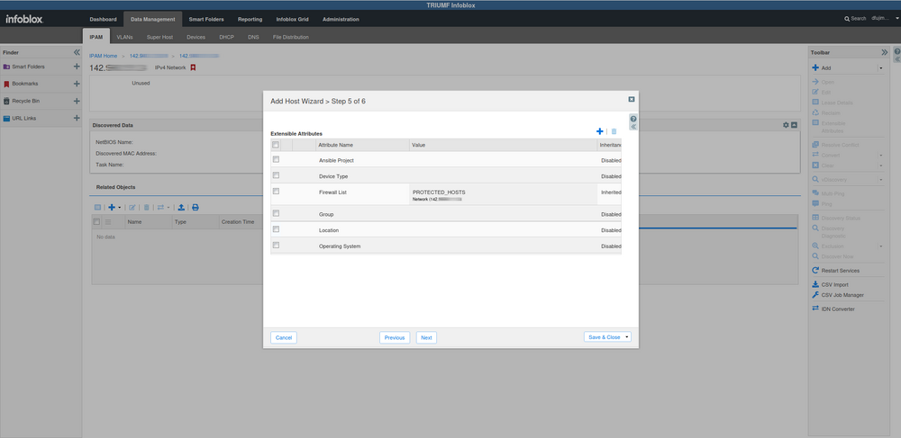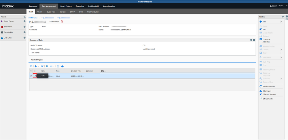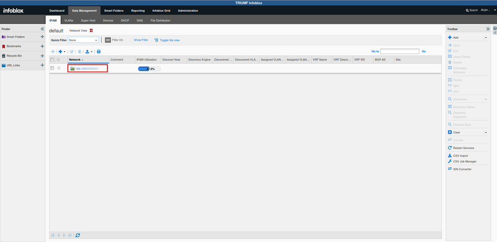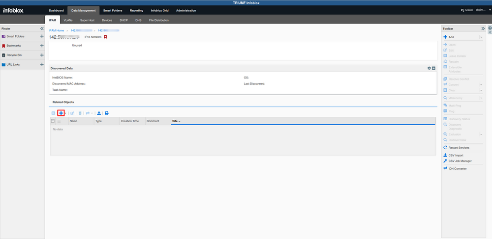 Infoblox Data Management IPAM tab. The Data Management tab has several sub tabs. They are mostly different ways of doing the same thing. The most useful one for our purposes is the IPAM (IP Address Management) tab. This one loads by default. Once there select your network.