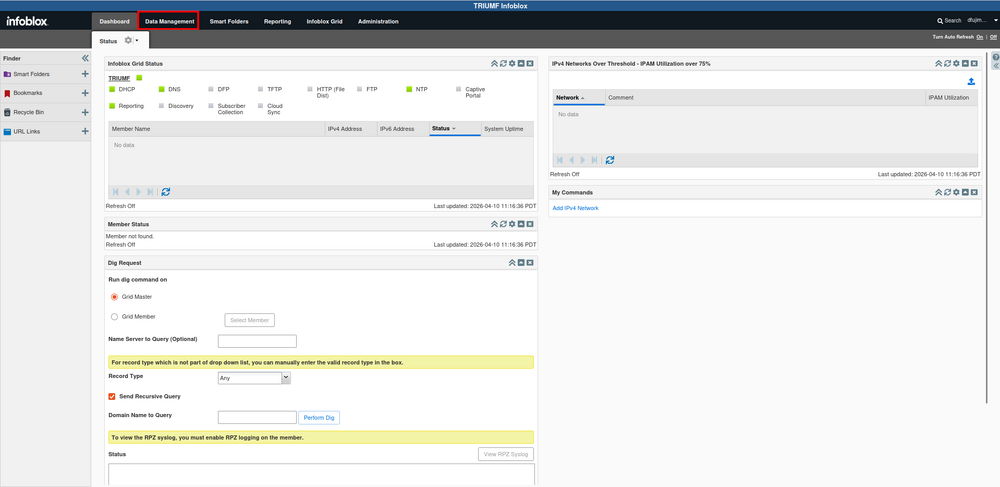 Infoblox status page. Most basic actions are accessed through the Data Management tab, highlighted in red.