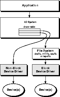 Figure 3-8 shows a layered model of I/O for both block and non-block (character) devices. This layered arrangement allows the same block device driver to be used with different file systems, and reduces the number of I/O functions that must be supported in the driver.