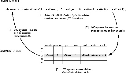 [1] The driver calls iosDrvInstall( ), specifying the addresses of the driver's routines for the seven basic I/O functions.