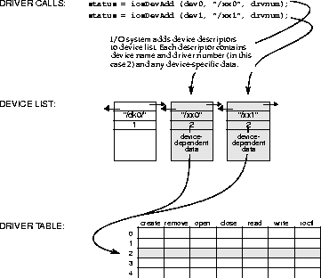 Figure 3-2 shows the actions taken by the example driver and by the I/O system when the initialization routine xxDrv( ) runs.