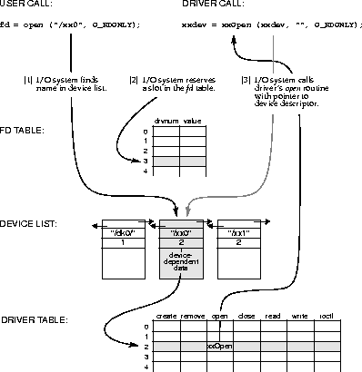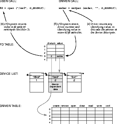[4] It executes xxOpen( ), which returns a value that subsequently identifies the newly opened file. In this case, the value is the pointer to the device descriptor. This value is supplied to the driver in subsequent I/O calls that refer to the file being opened. Note that if the driver returns only the device descriptor, the driver cannot distinguish multiple files opened to the same device. In the case of non-block device drivers, this is usually appropriate.