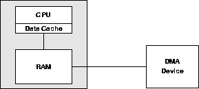 Drivers written for boards with caches must guarantee cache coherency. Cache coherency means data in the cache must be in sync, or coherent, with data in RAM. The data cache and RAM can get out of sync any time there is asynchronous access to RAM (for example, DMA device access or VMEbus access). Data caches are used to increase performance by reducing the number of memory accesses. Figure 3-7 shows the relationships between the CPU, data cache, RAM, and a DMA device.