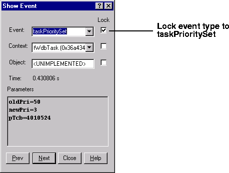 When the Show Event dialog box appears, the lower portion contains information on the event you selected. It lists all the instrumented information for the event. In addition, WindView initializes the search fields in the upper portion of the dialog box with the event type, context, and object ID (if you are using AIL logging) of the selected event. You can search for similar events by clicking the Lock box to the right of each field you wish to set criteria for and then clicking Prev or Next.