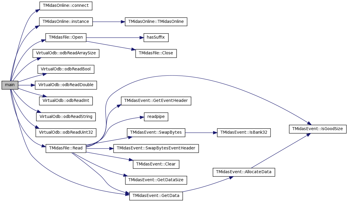 References TMidasOnline::connect(), TMidasEvent::GetData(), TMidasOnline::instance(), VirtualOdb::odbReadArraySize(), VirtualOdb::odbReadBool(), VirtualOdb::odbReadDouble(), VirtualOdb::odbReadInt(), VirtualOdb::odbReadString(), VirtualOdb::odbReadUint32(), TMidasFile::Open(), and TMidasFile::Read().